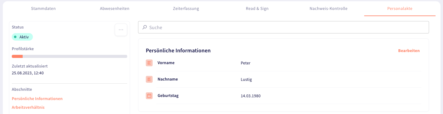 Links oben: der Status des Mitarbeiters, die Profilstärke und wann die Personalakte zuletzt aktualisiert wurde