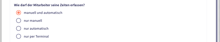 Öffnen Sie die Kachel "Einschränkungen" und scrollen Sie zur Frage "Wie darf der Mitarbeiter seine Arbeitszeiten erfassen?"