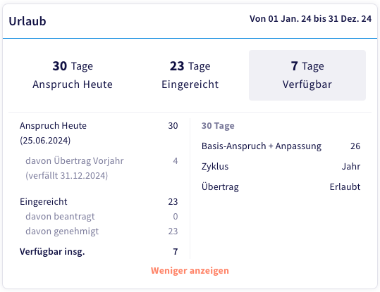 Anspruch heute: der Anspruch, der dem Mitarbeiter jetzt gerade zur Verfügung steht (bezieht sich in diesem Fall auf die obenstehende Jahresperiode und kann sich ändern, wenn Resturlaubstage aus dem Vorjahr verfallen oder eine manuelle Anpassung des Anspruchs vorgenommen wird)