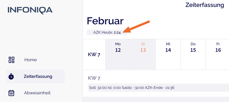 Den Stand Ihres Arbeitszeitkontos und damit Ihrer Überstunden können Sie auf dem Tab "Zeiterfassung" direkt unter dem Monat sehen. Dabei ist wichtig zu wissen, dass die Soll-Stunden des aktuellen Tages immer morgens abgezogen werden. Das bedeutet, dass Sie nach Feierabend den aktuellsten Stand des Arbeitszeitkontos sehen.